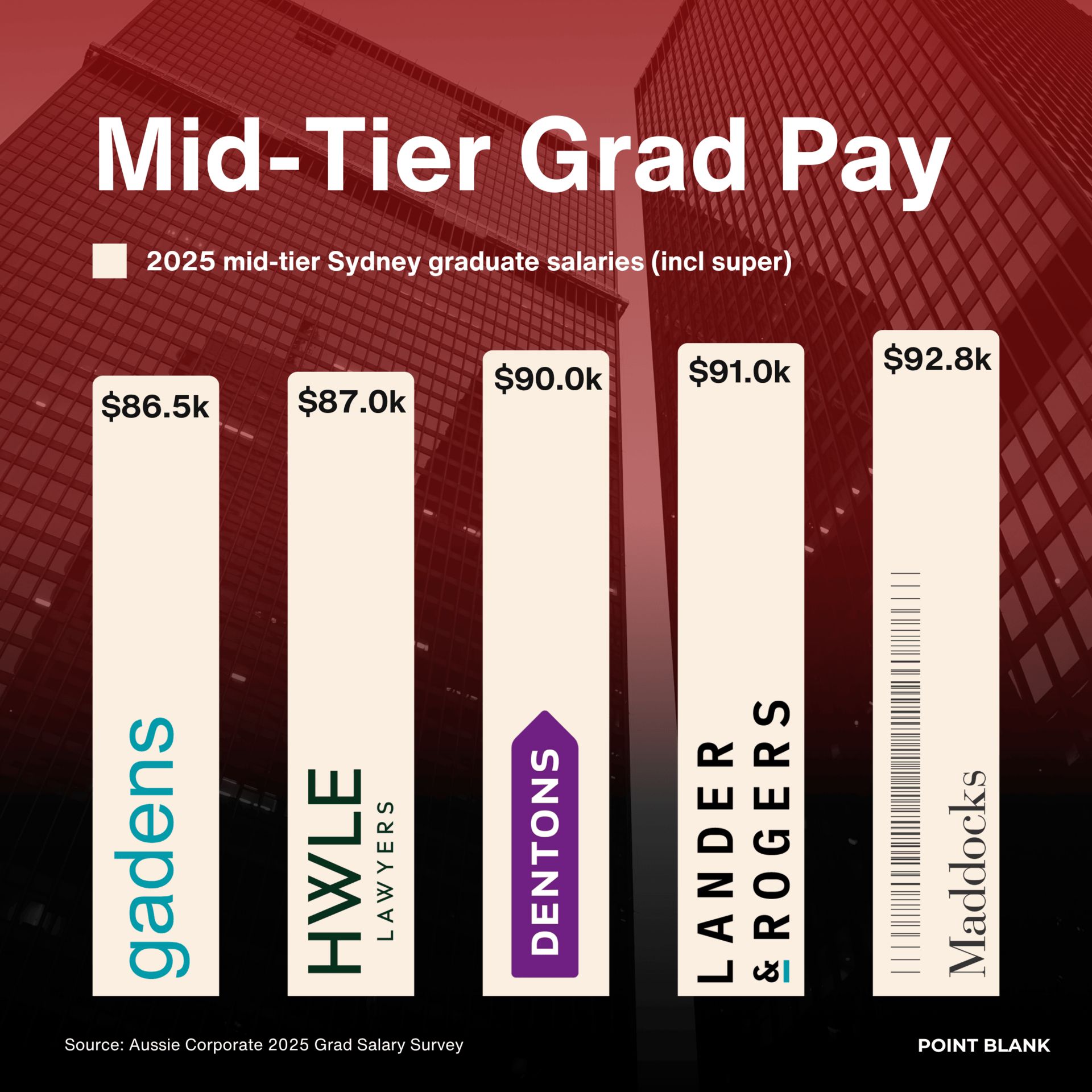 Sydney grads at mid-tier firms are pocketing $85k–$95k, with Maddocks ($92.8k), Landers ($91k) and Dentons ($90k) leading the pack. That’s about a $20k gap to HSF Kramer and G+T on $117k. But mid-tiers offer more flexibility, lighter targets and fewer late nights. The real question — is balance worth the pay cut? Check out our full post here.