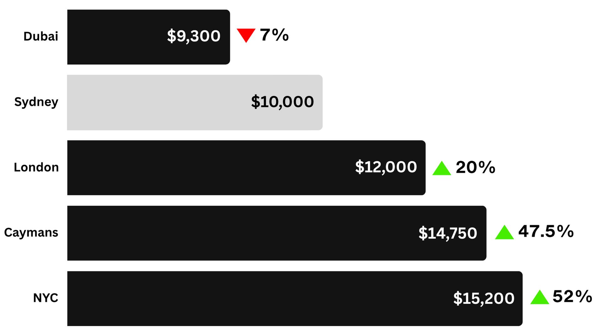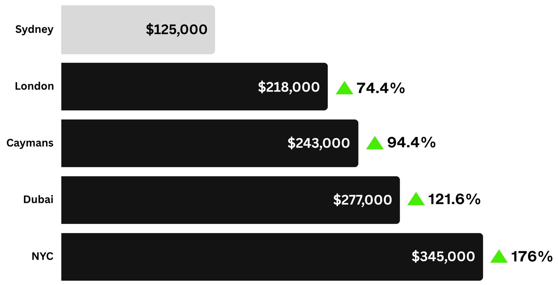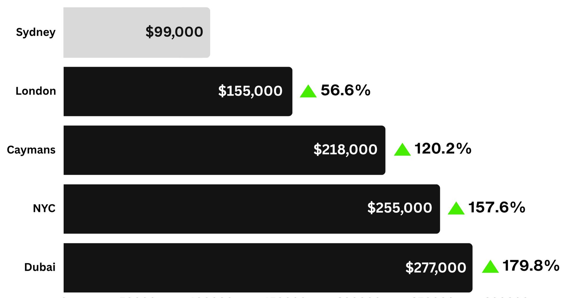 It’s a 74% jump in the Caymans (A$218k), 94% in London (A$243k) and 122% in Dubai (A$277k).
